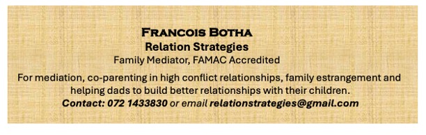 - I specialise in Family/Divorce Mediation and believe that the family matters. I specialize in mediation, co-parenting in high conflict relationships, and family estrangement. Work history: 13 years in the criminal justice system (Magistrate, Child Welfare Commissioner and gender-violence specialist). For the following 19 years I was the Director of the UCT Transformation Office, where I established and managed UCT's policies and practices in dealing with mediation, gender violence, racism and discrimination. I worked as mediator, trainer, and relations specialist, and with communities battling with conflict, gender-based violence and discrimination. I am a member of and accredited with FAMAC (Family Mediators' Association of the Cape) working primarily as a Family Mediator and Parenting Co-ordinator. I work with estranged families, assist with Parenting Plans and help dads to build better relationships with their children.